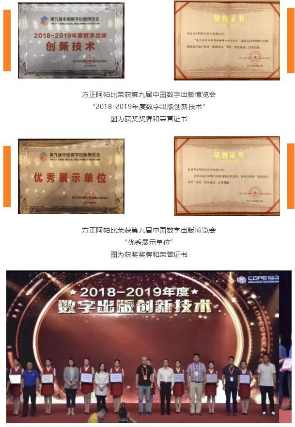 方正阿帕比榮獲第九屆中國(guó)數(shù)字出版博覽會(huì)“2018-2019 年度數(shù)字出版創(chuàng)新技術(shù)”圖為獲獎(jiǎng)獎(jiǎng)牌和榮譽(yù)證書
