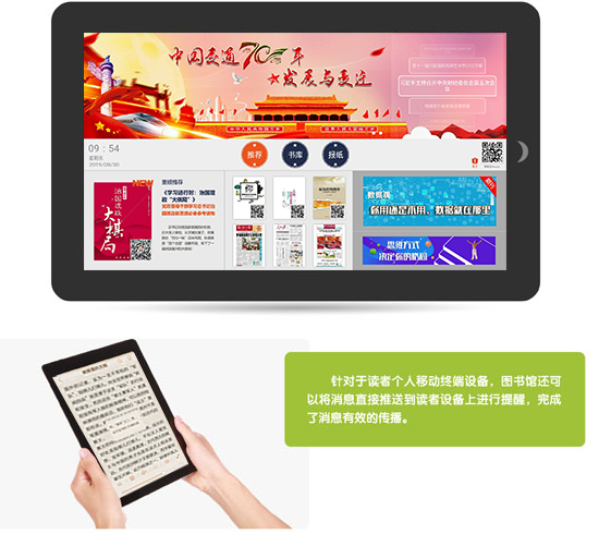 方正愛讀愛看移動終端解決方案也為圖書館提供了移動門戶解決方案:機構可以將館內的介紹、公告、活動等一系列信息資訊通過后臺編輯,靈活的調整到各移動終端上進行展示。針對于讀者個人移動終端設備,圖書館還可以將消息直接推送到讀者設備上進行提醒,實現(xiàn)了消息有效的傳播。