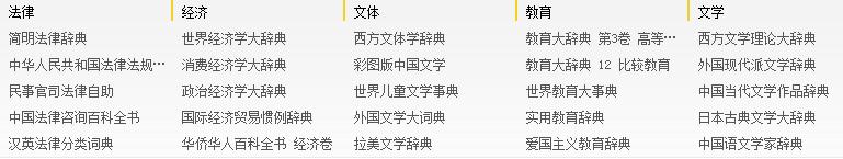 主要收錄國內(nèi)各大出版社各個領(lǐng)域的權(quán)威工具書,目前已經(jīng)收錄了《中國大百科全書》、《漢語大詞典》、《辭海》等權(quán)威工具書;