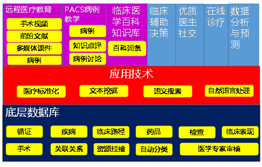 依托于方正阿帕比醫(yī)藥領(lǐng)域相關(guān)的豐富底層資源,應(yīng)用中文分詞技術(shù)、非結(jié)構(gòu)化信息抽取、文本挖掘、自然語言處理、語義搜索和數(shù)據(jù)統(tǒng)計(jì)分析預(yù)測等先進(jìn)技術(shù),打造一個(gè)集臨床醫(yī)學(xué)百科知識、臨床輔助決策、PACS病例教學(xué)、在線診療、遠(yuǎn)程醫(yī)療教育等功能于一體的醫(yī)療知識服務(wù)平臺,從而為醫(yī)學(xué)院學(xué)生和住院醫(yī)師提供學(xué)習(xí)參考,提高廣大基層醫(yī)療人員的醫(yī)療水平,為醫(yī)生提供臨床輔助決策,提供優(yōu)質(zhì)醫(yī)生互動交流和學(xué)習(xí)提高平臺,為醫(yī)院和醫(yī)療監(jiān)管部門提供數(shù)據(jù)分析和趨勢預(yù)測。