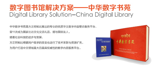 中華數(shù)字書苑是方正阿帕比推出的專業(yè)優(yōu)質(zhì)華文數(shù)字內(nèi)容整合服務(wù)平臺(tái),收錄了建國(guó)以來大部分的圖書全文資源、全國(guó)各級(jí)各類報(bào)紙及年鑒、工具書、圖片等特色資源產(chǎn)品,旨在為圖書館、學(xué)校、企業(yè)、政府等客戶及其所屬讀者提供在線閱讀、全文檢索、離線借閱、移動(dòng)閱讀、下載、打印等數(shù)字內(nèi)容和知識(shí)服務(wù)。